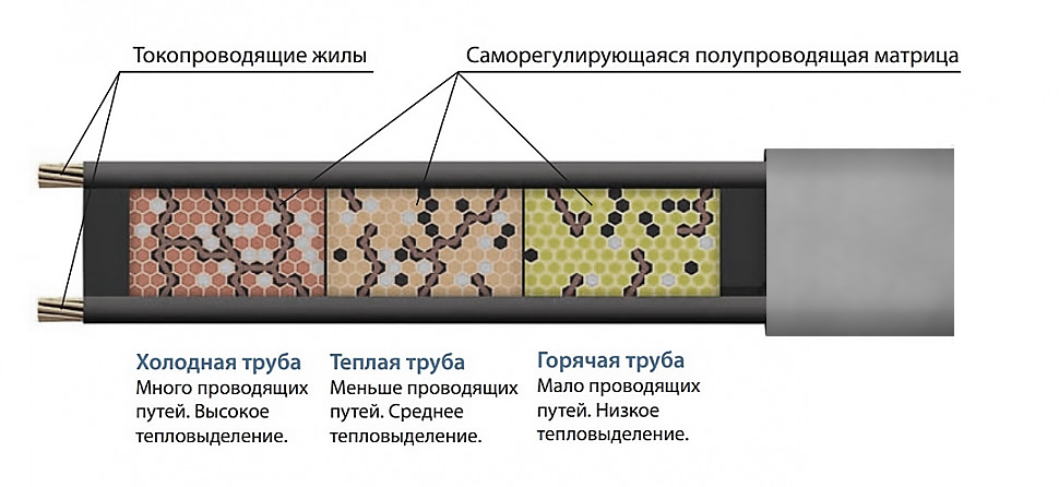 Нагрев происходит за счет прохождения электрического тока через полупроводящую саморегулирующуюся матрицу от одной токопроводящей жилы к другой. Матрица изменяет свое сопротивление в зависимости от температуры поверхности, на которую уложен нагревательный кабель. За счет этого обеспечивается эффект саморегулирования, то есть линейная мощность кабеля меняется в ответ на изменение температуры поверхности (при повышении температуры поверхности сопротивление матрицы увеличивается, мощность уменьшается и наоборот).