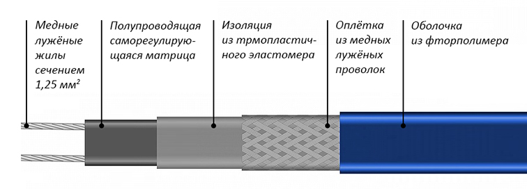 Саморегулирующийся кабель — автоматически регулирует мощность, в зависимости от окружающей температуры. Теплоотдача по всей длине кабеля может быть разной. Минимальный риск перегрева.