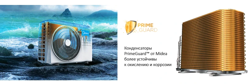 • Система PrimeGuard™ от Midea — защита теплообменника, обеспечивает усиленную устойчивость к окислению и коррозии, по сравнению с обычными ребрами конденсаторов, продлевая срок службы.