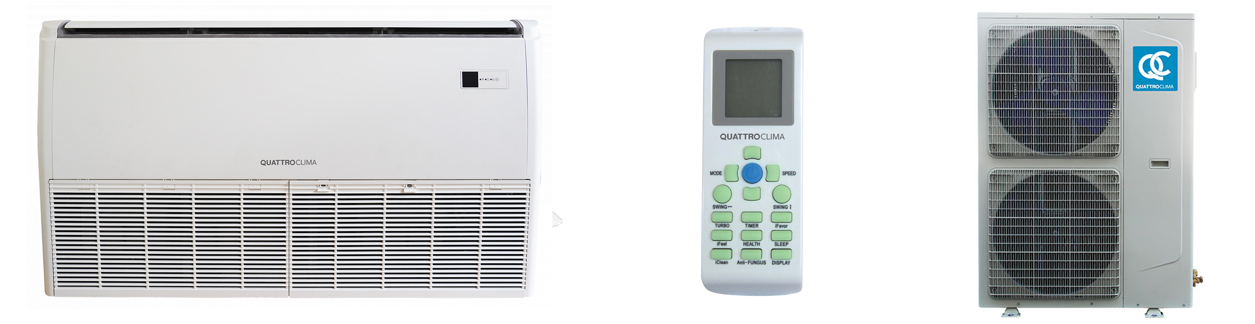 Сплит-система постоянной производительности, применяется для кондиционирования торговых и офисных помещений большой площади или сложной формы. Главное достоинство — универсальность монтажа, его можно устанавливать как на полу вдоль стены, так и под потолком. Работает в 4 режимах: охлаждение, обогрев, вентиляция и осушение.