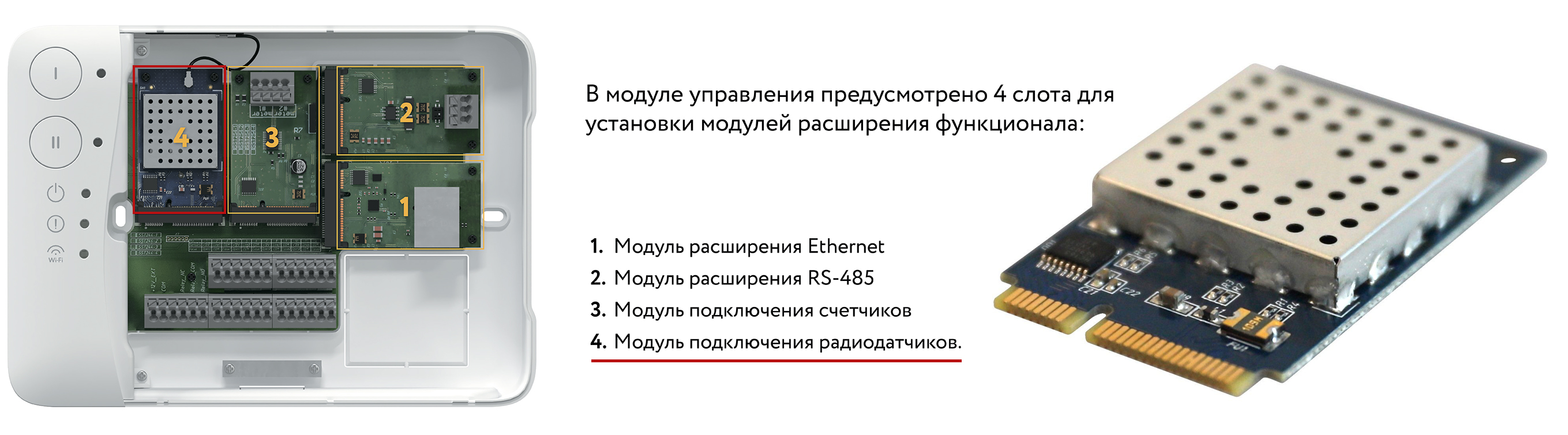 Посредством радиомодуля можно подключить до 50 беспроводных датчиков протечки воды.