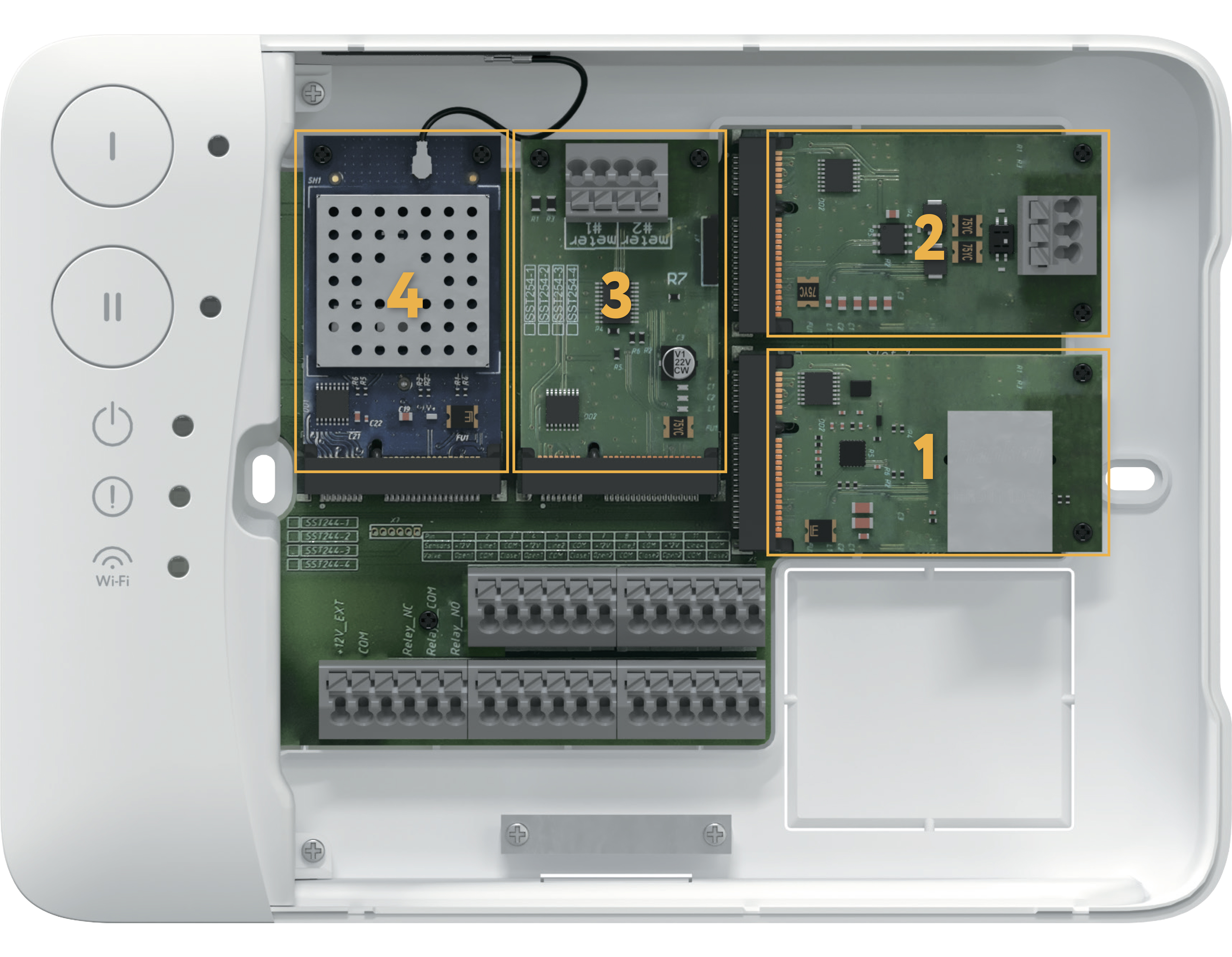 Плата RS-485 – для систем диспетчеризации, Плата Ethernet – для проводного подключения в случае невозможности организации подключения к Wi-Fi, Модуль подключения счетчиков ГВС/ХВС, Модуль подключения радиодатчиков