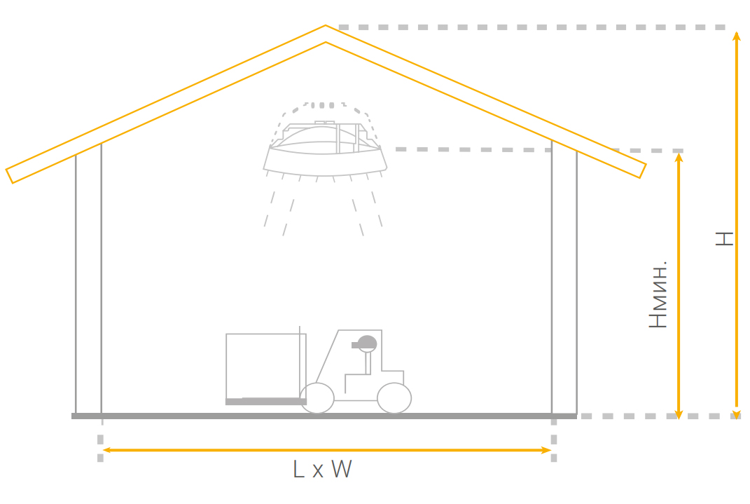 Пример определения минимальной высоты монтажа дестратификатора VOLCANO VR-D: H мин = ¾ × Н