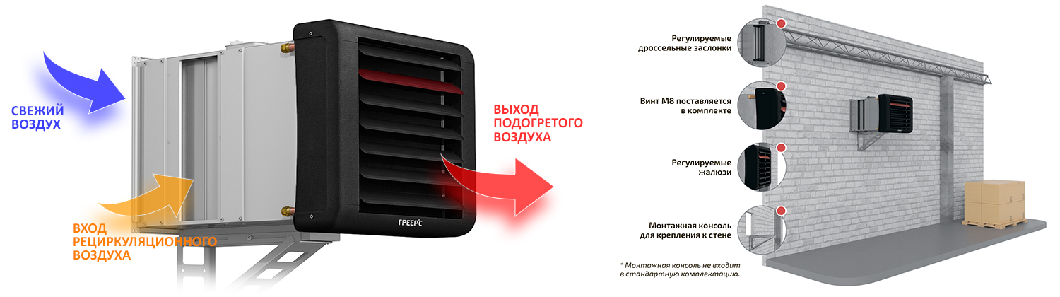 Для камеры смешения с водяным тепловентилятором ГРЕЕРС ВС применяется как настенный, так и подпотолочный монтаж. Крепление к стене производится с помощью монтажной консоли (консоль приобретается отдельно).