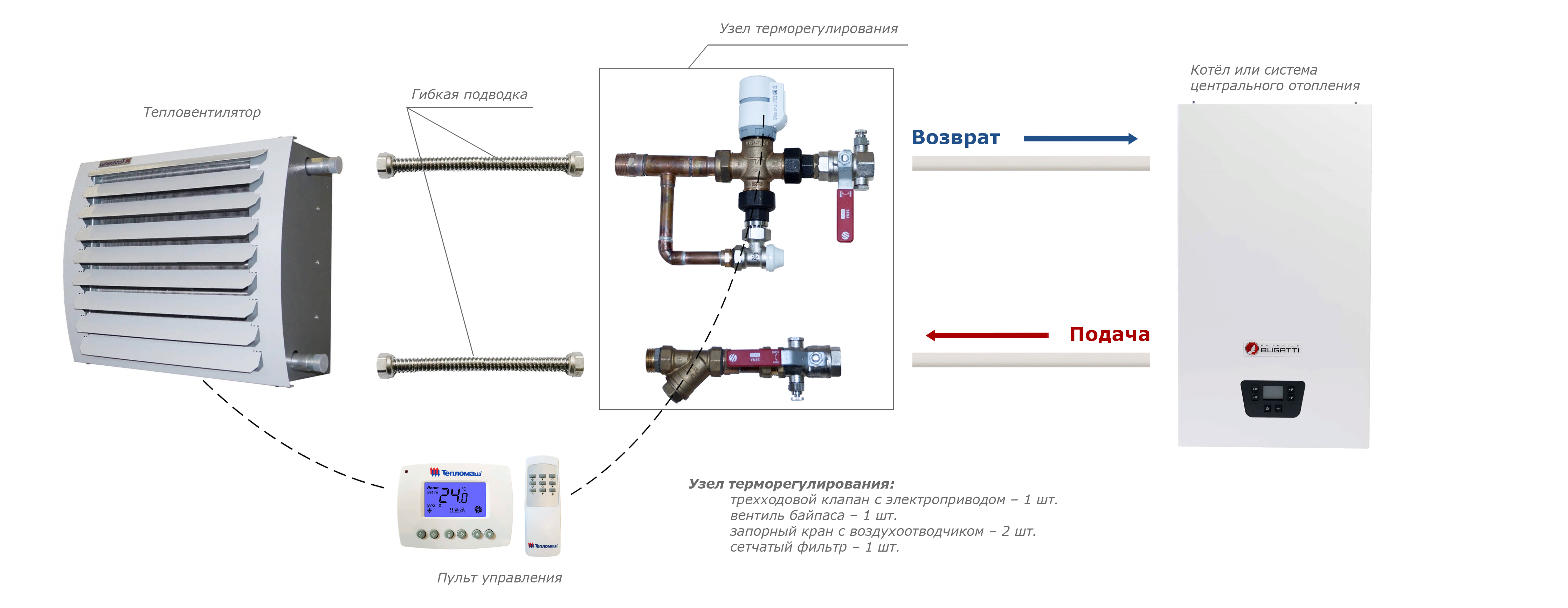 - Стандартная комплектация: тепловентилятор + проводной пульт HL10 с электронным термостатом — поддержание заданной температуры осуществляется за счет включения/выключения вентилятора и его работы на выбранной скорости. При достижении необходимого уровня температуры вентилятор отключается, теплоноситель продолжает циркулировать.