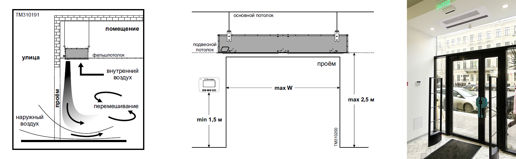 Тепловая завеса смесительного типа, предназначена для защиты помещений от прямого контакта с наружным воздухом через открытые двери в холодный период времени. Встраивается в подвесной или фальш-потолок над дверным проёмом, на высоте не более 2,5 м. Подходит для установки в кафе, торговых павильонах, салонах красоты, гостиницах, медицинских центрах и др.
