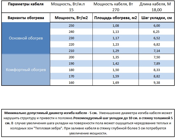 Площадь обогрева секцией кабеля напрямую зависит от требуемой мощности на 1 м².